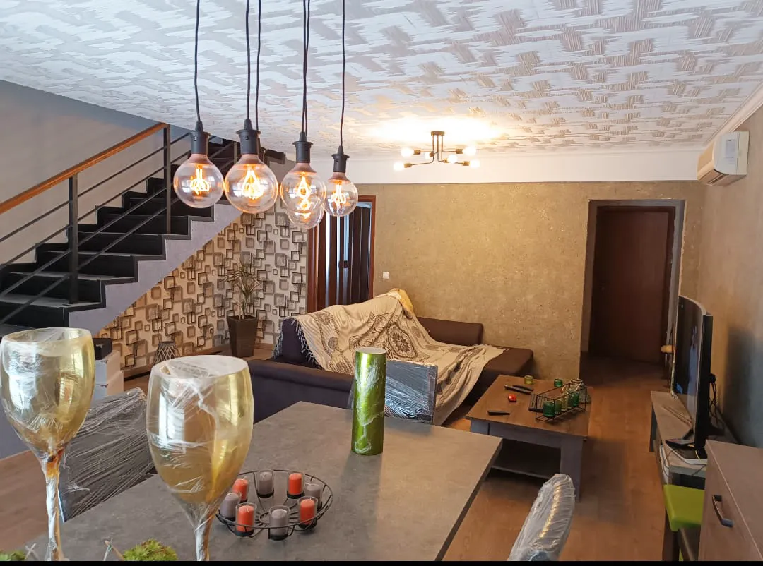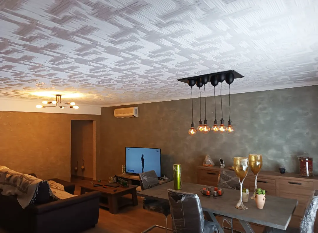 En el salón, el revestimiento HOMESTAR “NORMA” en el techo y el modelo “PARIS” en las paredes crean una fusión perfecta entre textura y elegancia.