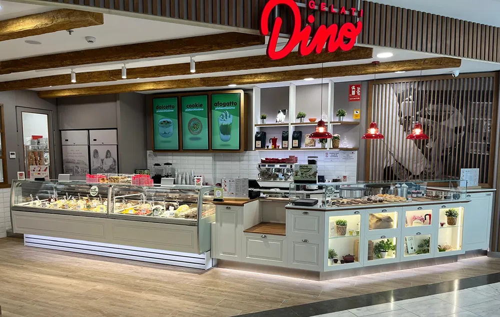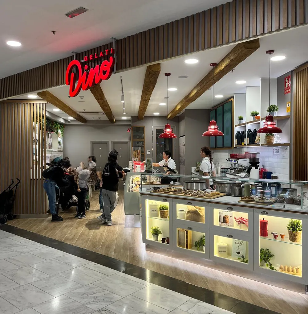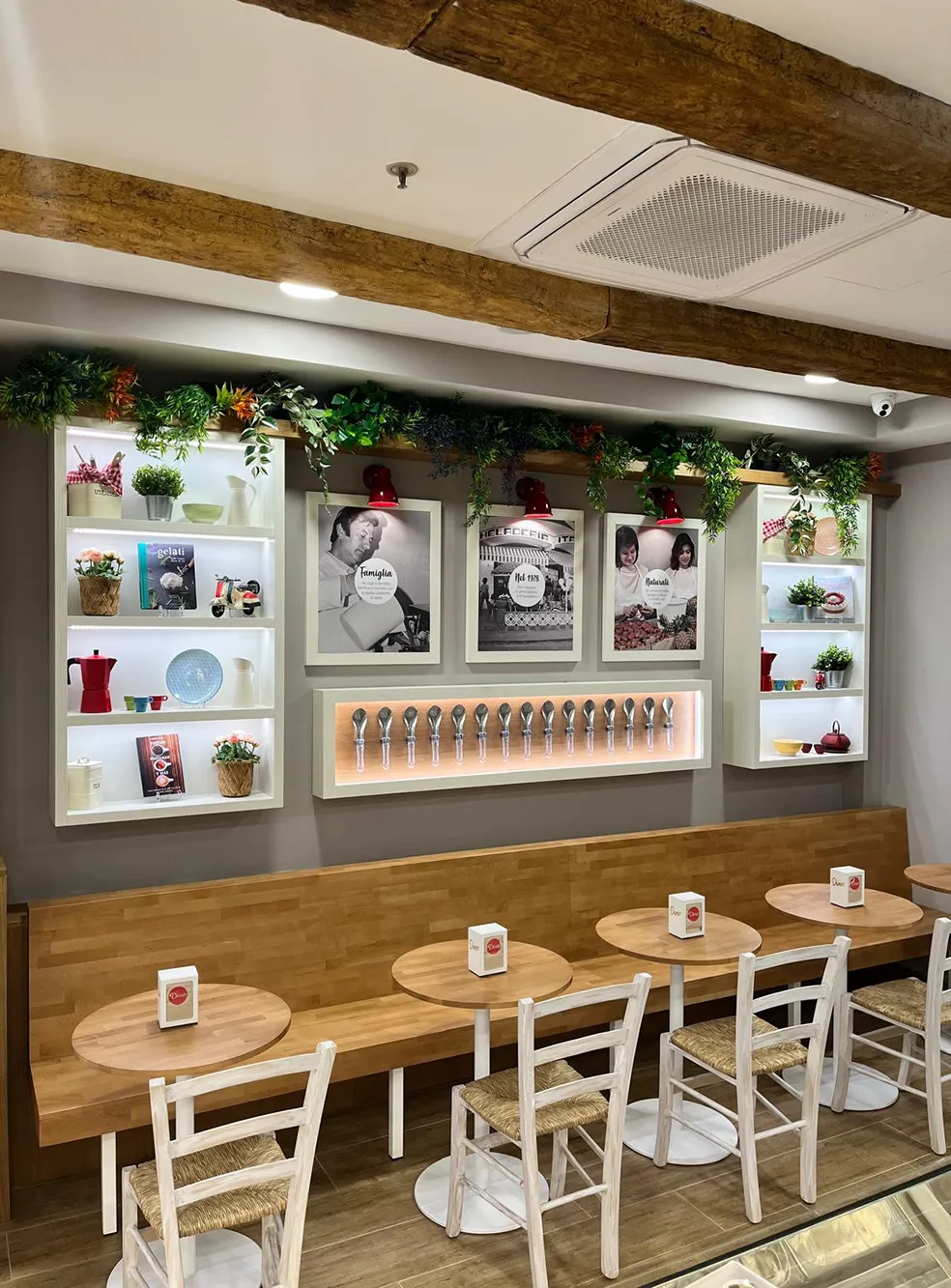 La nueva decoración de las heladerías Gelati DINO ha ganado aún más encanto con la aplicación de las Vigas Decorativas HOMESTAR (Imitación de Madera Real – color Moderna).