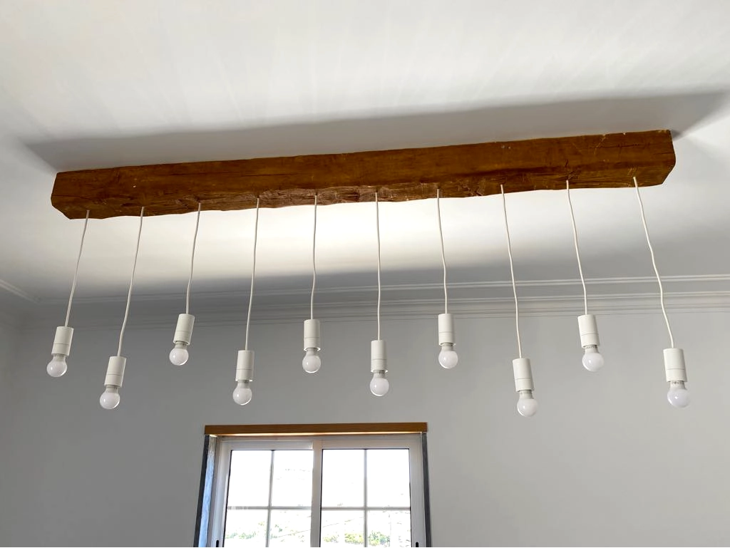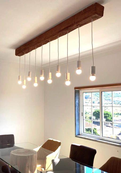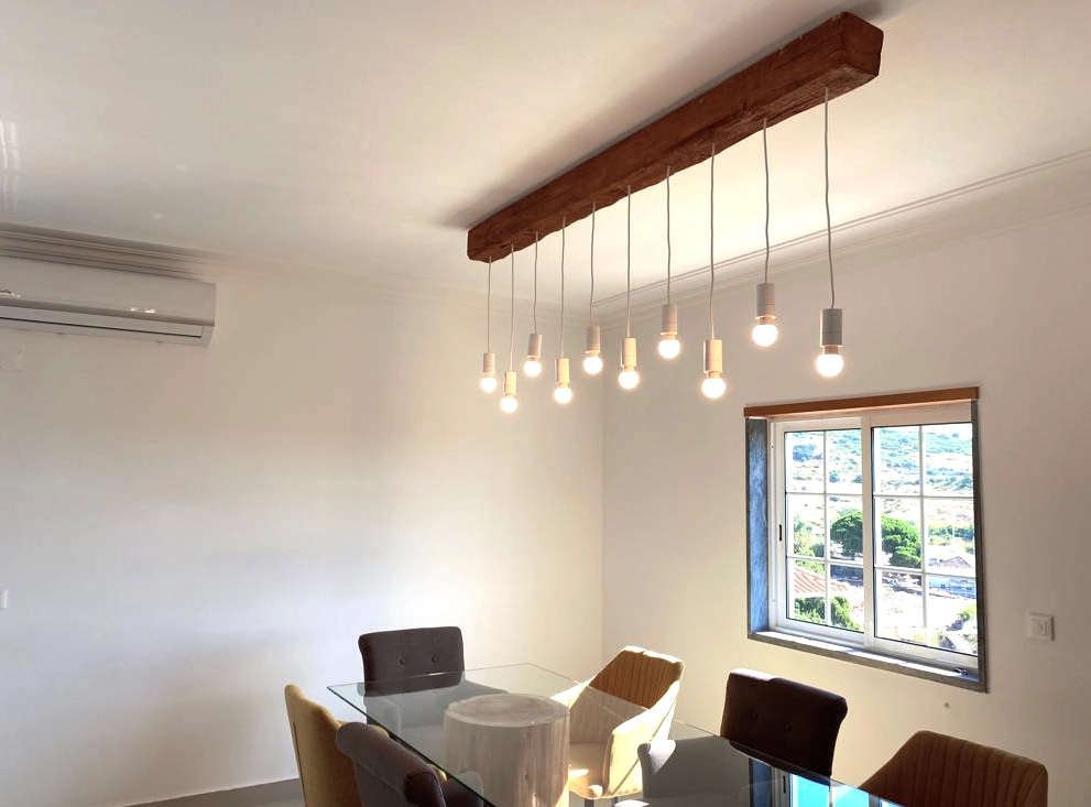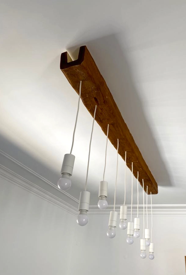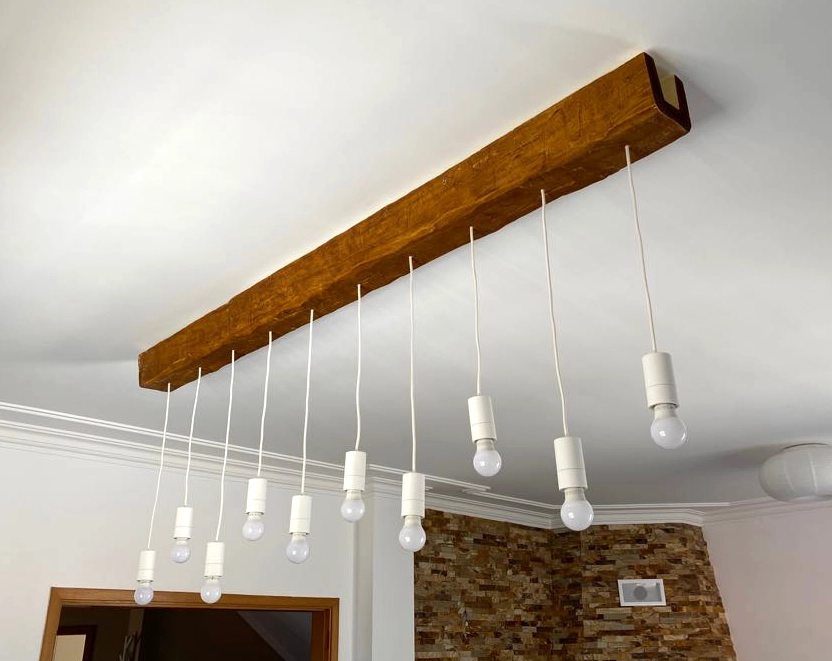 En este comedor, la VIGA HOMESTAR 12×12 en color Rústica fue utilizada como soporte para una lámpara, dando vida a una solución decorativa tan funcional como sorprendente.